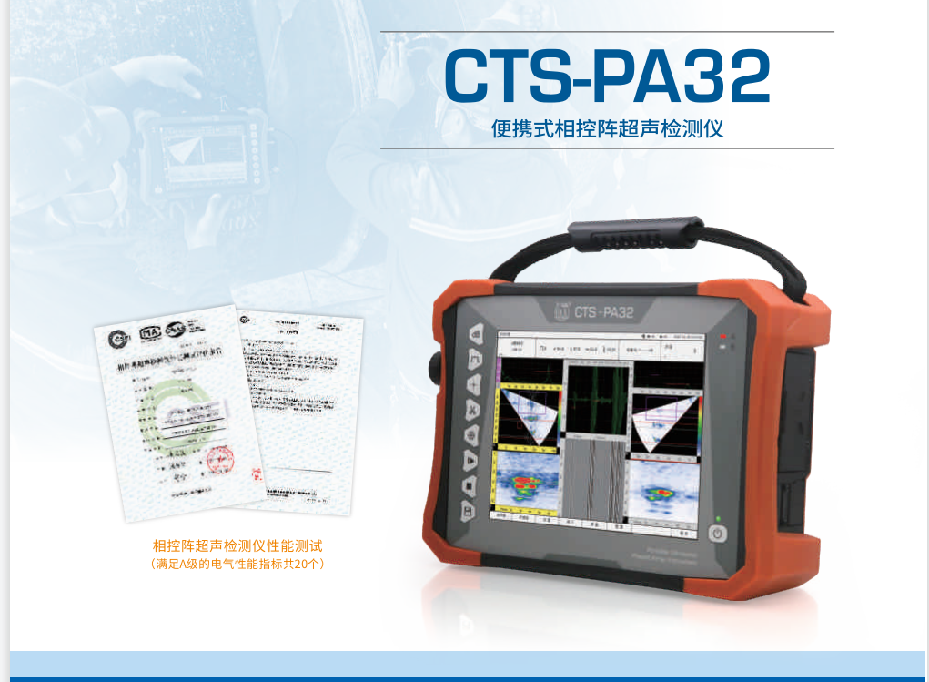 CTS-PA32便携式全聚焦相控阵超声检测仪是达到32:128个检测通道的便携式全聚焦相控阵检测仪器;仪器具备常规超声、TOFD、传统相控阵、全聚焦成像、TOFD与相控阵同时扫查,支持双阵列探头等功能;仪器采用防水、防油面板,可触屏操作,实现检测数据全程记录,是国产先进的智能化相控超声检测设备。仪器一次性通过中国特检院的质检达到B级性能要求。